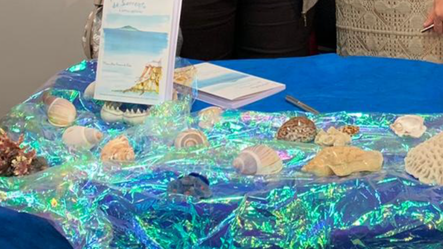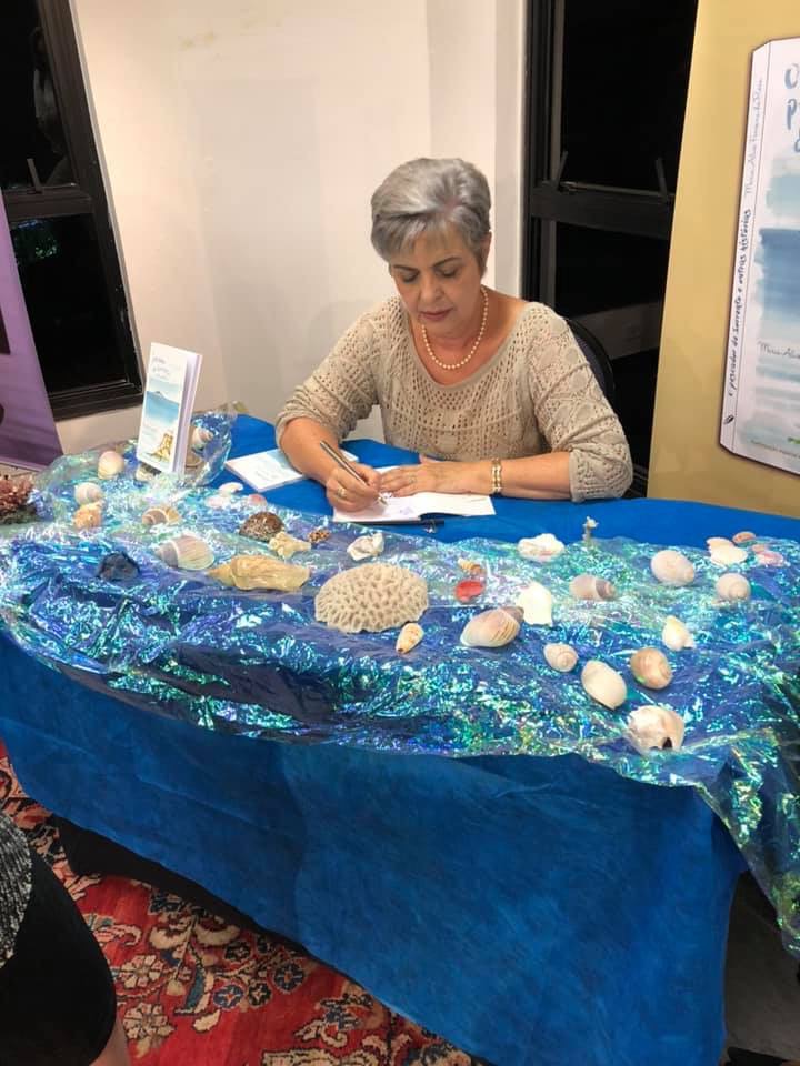 O conto que deu nome ao livro se desenrola no ambiente do mar, e, para o lançamento, foi-me preparada, pela Nina Kuznetzow, uma mesa que trazia o fundo do mar. Linda.