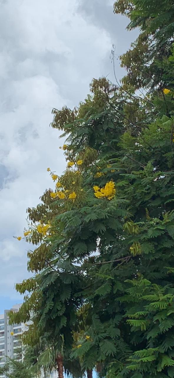 Contra o céu azul malhado de nuvens brancas, uma sibipiruna coloca estrategicamente sua folhagem de um verde forte, salpicado de delicadas flores de intenso amarelo.