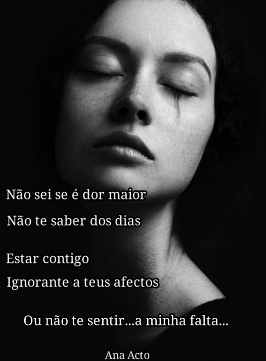 Não sei se é dor maior Não te saber dos dias Por onde espalhas teu sorriso Ou onde pousam teus olhos! Ou estar contigo Ignorante a teus afectos Num abraço íntimo contido Numa entrega casta e medida Não sei amor Qual maior é a dor... Sinto-te a leveza E não a sei se consentida com tua tristeza Ou se liberta na realidade que vivemos E tudo me dói ... Tudo o que fomos Tudo o que não nos foi E quiça, o que nunca seremos Não sei amor Tanto que não sei ... E nessa incerteza cruel que se me adentra Olho-te nos olhos... E não te sinto A minha falta...